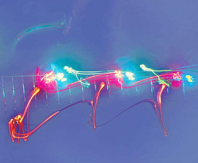 A study in minimalism and the elegance of pull offs on the fretboard, Hot and Cold is a sophisticated, elegant work that embodies the signature style of Morse exquisitely. The work utilizes a highly simple color palette of royal blue and red.