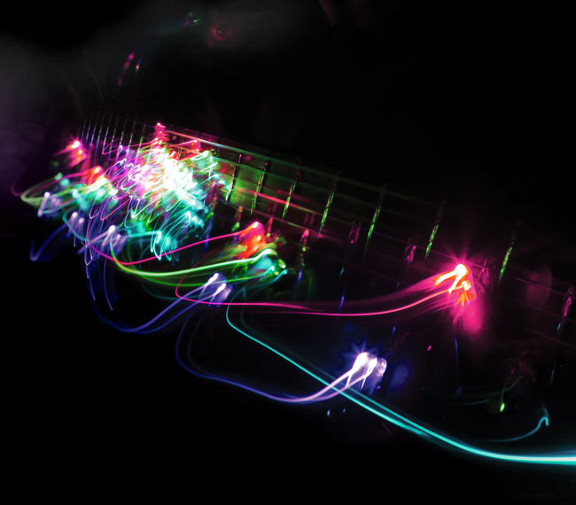 Morse's powerful and fiery exploration of the fretboard resulted in the work Fretful. Hammer ons and pull offs can be seen on the right side of the canvas. To the left side, we see Morse's fingers blazing around the twelfth fret.